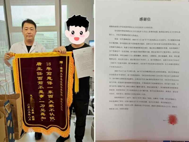 阿杰及家属对深圳大学总医院,特别是唐志元副主任医师及耳鼻咽喉头颈外科医护团队表达了最诚挚的感谢,并送上了锦旗和感谢信。“感谢唐医生的专业判断和精湛技术,没有整个团队细致的手术,我这根‘心头刺’还不知道要扎多久。感谢所有医护人员的精心照料。”
