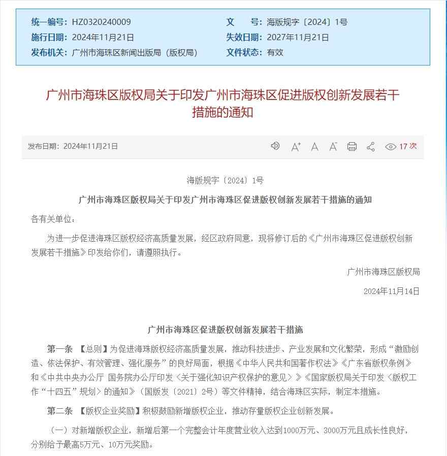 记者获悉,多年以来,广州市海珠区持续安排财政奖励资金,助推区内文化产业发展。今年6月,海珠区发布数字文娱“十条”,推出微短剧等细分赛道扶持举措,给予单一主体每年最高300万元奖励。在此之前,海珠区升级了全国首个区级版权产业专项扶持政策“海珠版权十条”至2.0版,新增版权贸易扶持条款,简化申报流程、优化奖励等级、降低准入门槛;修订游戏产业政策,鼓励研发创新,扶持精品出海。