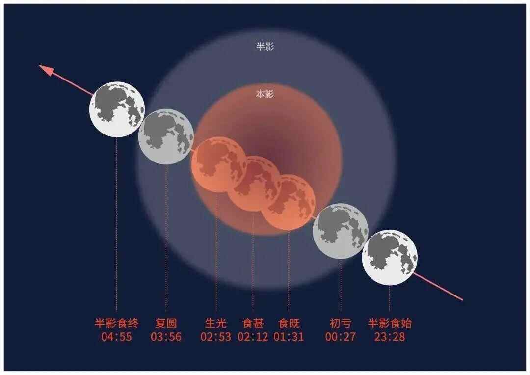 本次月全食各阶段时间点和见食情况示意图 (来源/《天文爱好者》杂志)