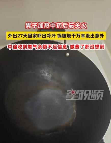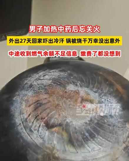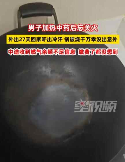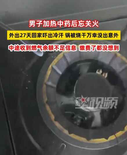 近日,男子加热中药后忘关火,外出27天回家吓出冷汗,锅被烧干万幸没出意外。