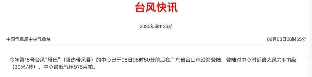 中央气象台发布台风“塔巴”登陆快讯