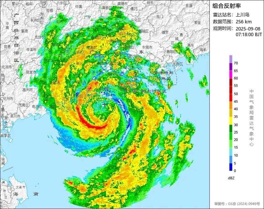 9月8日7时18分,接近登陆的台风“塔巴”气象雷达影像 中国气象局雷达气象中心上川岛雷达图