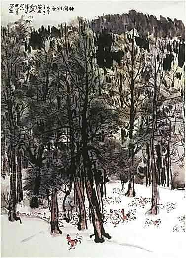 时值“五一”劳动节,一大早用过早餐后,关山月说,今天是劳动节,我们去劳动(写生)。于是,带上宣纸及笔墨工具,一行来到离哨所50多米的树林下,选好角度。在动笔之前他对大家说:“今天难得与你们在一起,我就现场认真地画一幅与大家共勉。”通过认真细致的观察,先生选择用高视角构图,大笔勾画出前景中的几棵木麻黄树,用娴熟的笔墨把树的特征、质感与空间表现出来,中景采用有阳光感的树来过渡,后景用浓墨与淡墨交融画出防风林的气势。布局中,前景树下既是留白又是表现沙质地,画面疏密处理得当。基本完成画面时,关山月说沙地画什么来点缀呢?此时正好从哨所处走过来两三只鸡(哨所小厨房所养),他见状连声叫好,说:就画鸡,而且是一大群鸡,题目我都想好了,叫《林间鸡舍》。由此,现场引发出他的一段具有艺术理论高度的话:“我们写生作画源于生活而高于生活,要从生活中去提升意境,今天写生现场没有大鸡群,为提升画的主题与意境,我把鸡群引入画面,合理安排,丰富了画面的内容。绘画艺术不能满足于如实反映生活,画景物不是创作的目的,创作必须赋予景物的描画以及作者的思想感情。”