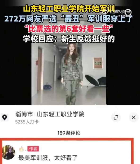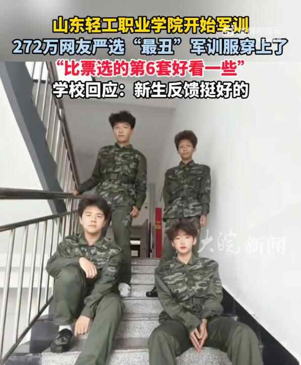 有新生说,“270多万网民投的‘最丑’军训服穿上了”。有新生评价,“裤子难看,像束脚裤。”但也有新生直呼“最美军训服,太好看了,非常满意。”
