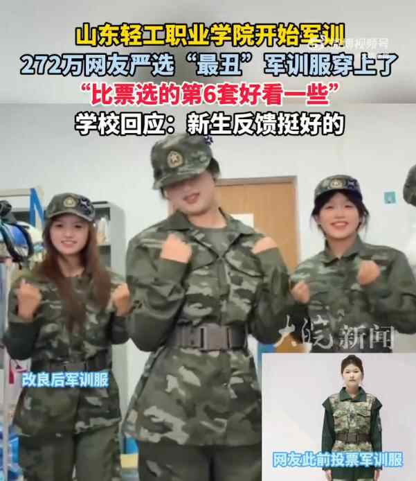 此前,山东轻工职业学院答复记者称,新生军训服将在第6套的基础上,结合专家、新生意见综合考虑后,对颜色和版型进行调整。而此次,新生们收到的正是“改良版”。