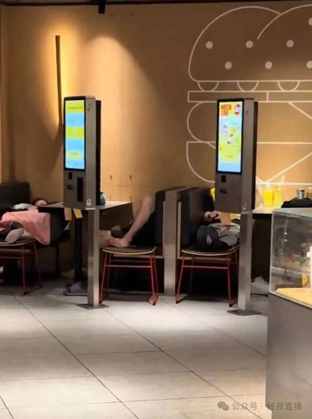 网友发布的视频显示,推开该餐厅店门后,可见多位无家可归者躺在靠墙的椅子上睡觉。网友在视频中表示:“四平路的这家麦当劳真的被毁掉了,打开门以后一股脚臭味,其实这家麦当劳蛮有公德心的,有很多无家可归的人,他们可以在这里度过一个有空调的晚上,但是这些人不能影响到其他正常食客进餐。”