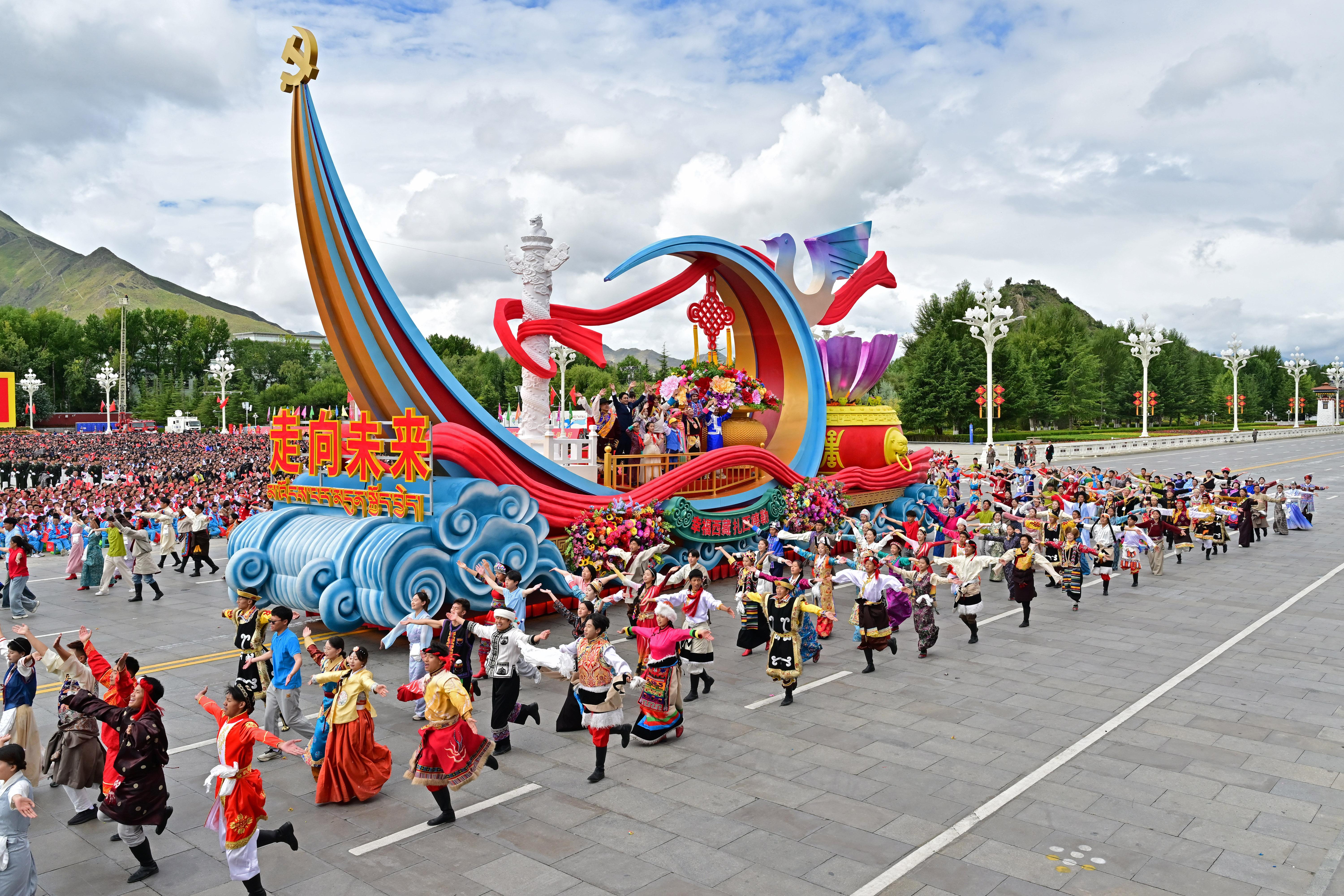 △8月21日上午,西藏各族各界干部群众约2万人欢聚拉萨市布达拉宫广场,热烈庆祝西藏自治区成立60周年。这是游行的彩车通过布达拉宫广场。