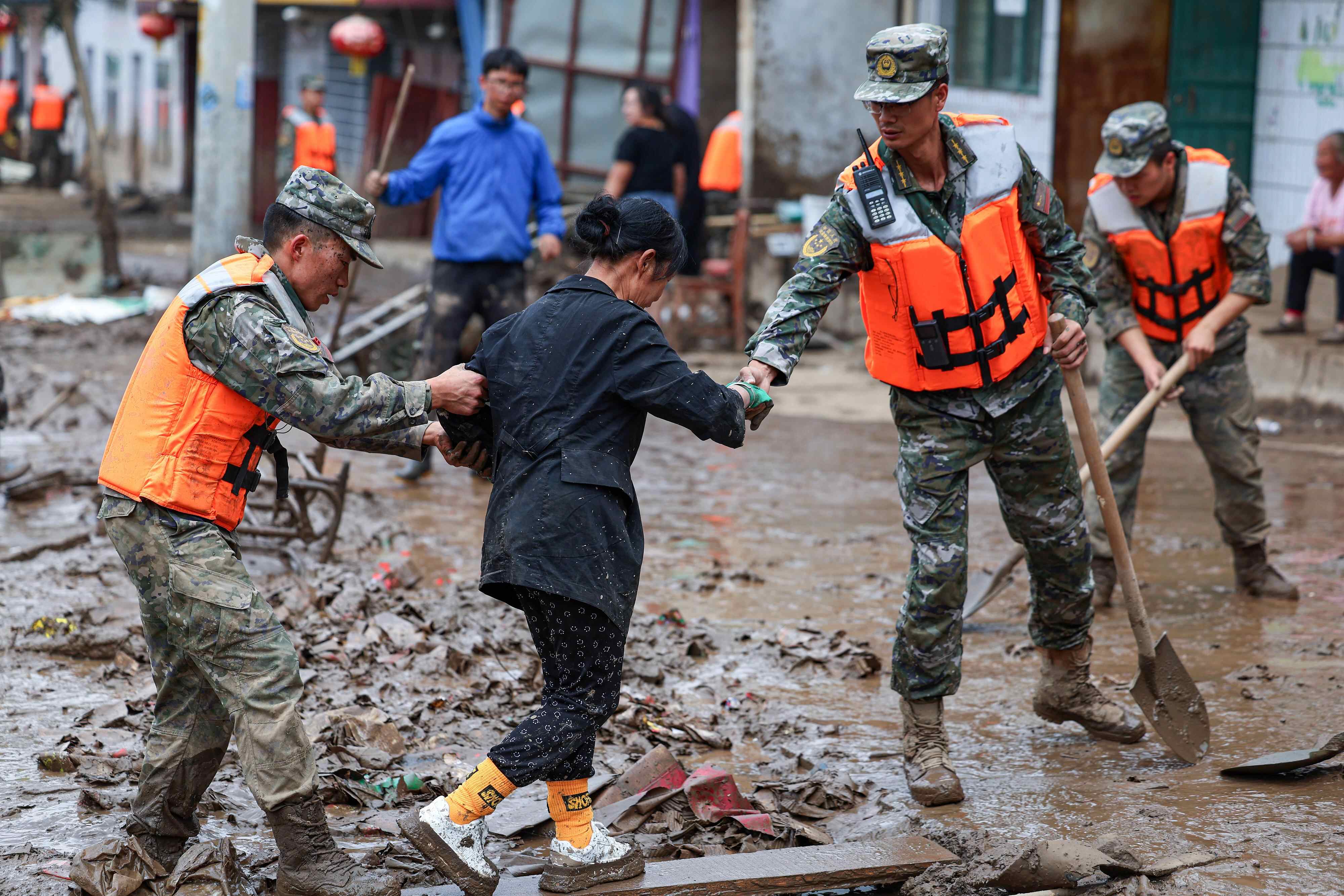 △2025年8月9日,武警甘肃总队机动支队官兵在兰州市榆中县城关镇兴隆山村帮助受灾群众通过淤泥区。