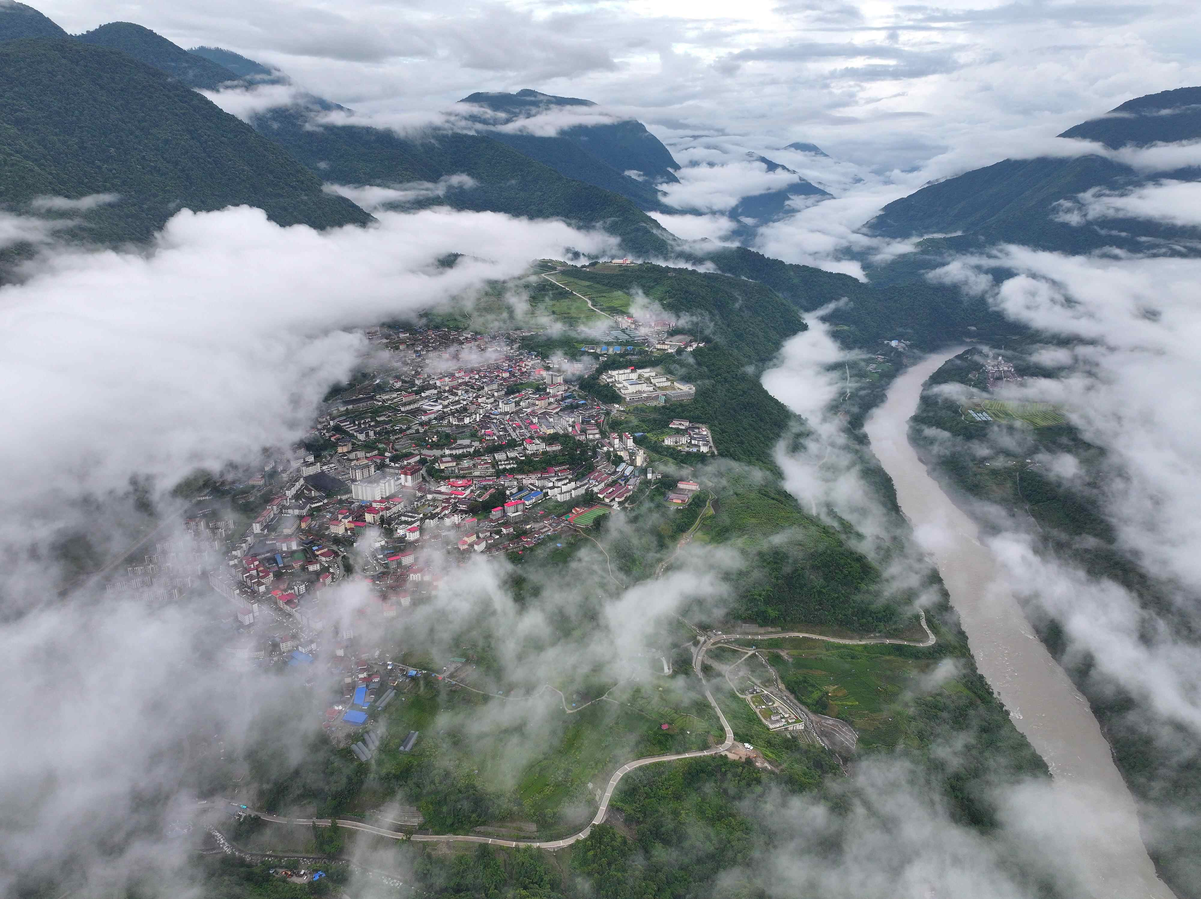 △2025年7月29日,西藏自治区林芝市墨脱县城云雾缥缈。城市、山峦与蜿蜒流淌的雅鲁藏布江相互映衬,宛如一幅美丽的生态画卷。