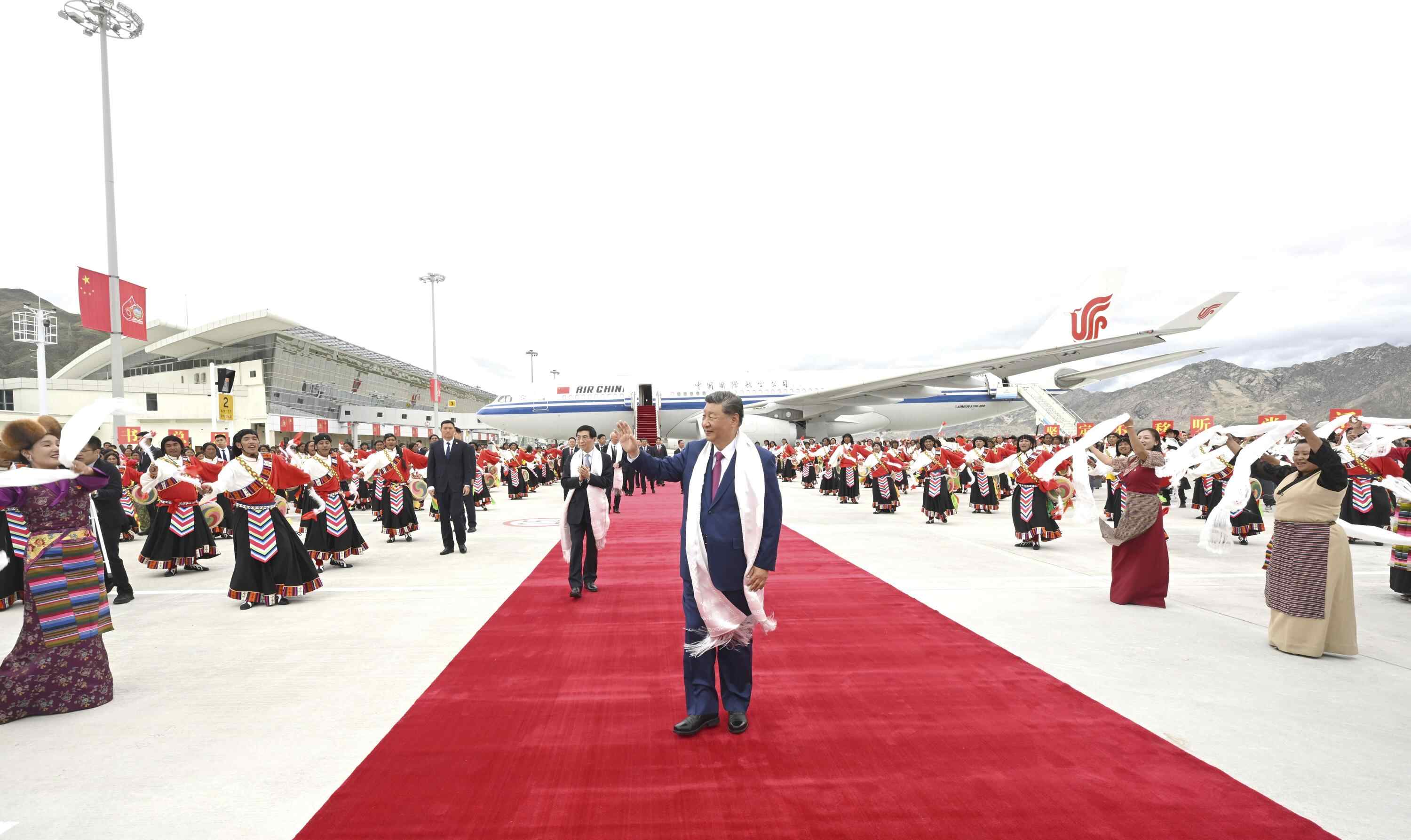 △8月20日中午,中共中央总书记、国家主席、中央军委主席习近平率中央代表团乘专机抵达拉萨,出席西藏自治区成立60周年庆祝活动。