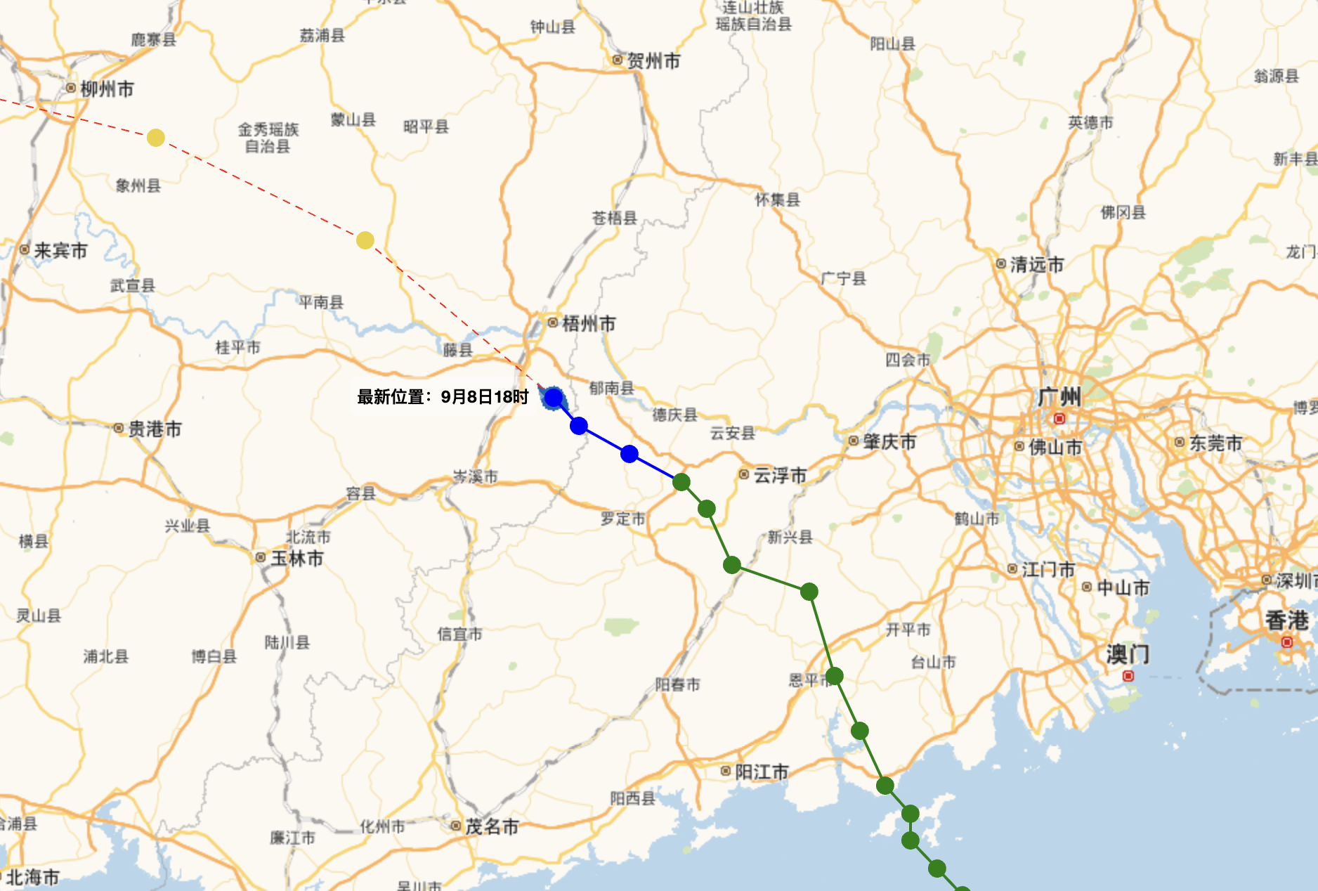 根据中央气象台观测,截至9月8日18时,今年第16号台风“塔巴”的中心,已经从广东省云浮市移入广西壮族自治区梧州市境内,正式移出广东。在其移出广东时,“塔巴”已由9月8日早晨8时50分登陆台山时的中心附近最大风力11级强热带风暴强度,减弱为中心附近最大风力8级的热带风暴强度。