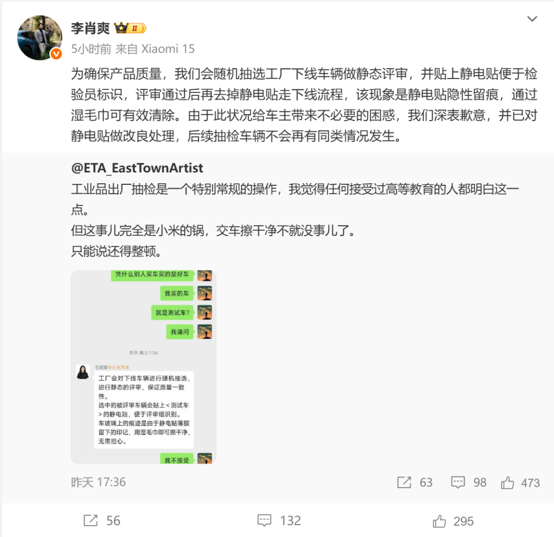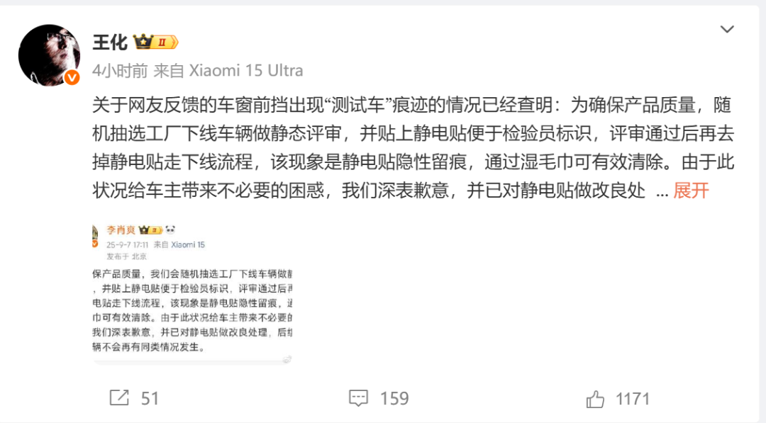 对此,小米汽车副总裁李肖爽和小米集团公关部总经理王化相继发文回应: