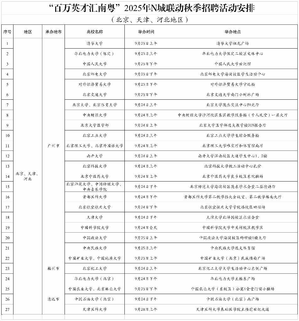 9月8日,记者获悉,由广东省委、省政府联合教育部主办的“百万英才汇南粤”2025年N城联动秋季招聘活动(以下简称“N城联动秋招活动”)将于9月下旬启动。京津冀地区高校站作为本次N城联动秋招活动首发站之一,将正式吹响金秋“引才”号角,开启校地联动、共促人才发展的新篇章。