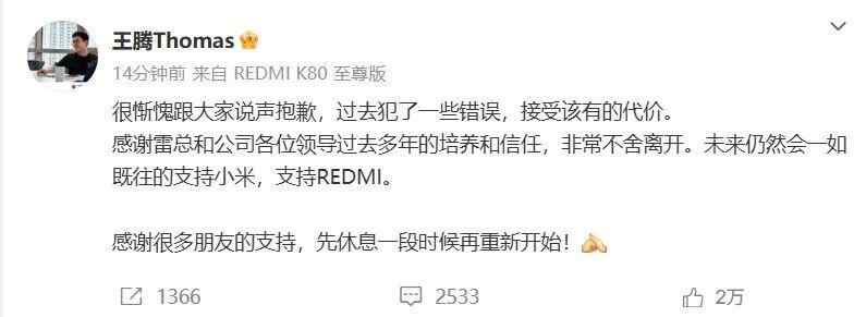 感谢雷总和公司各位领导过去多年的培养和信任,非常不舍离开。未来仍然会一如既往的支持小米,支持REDMI。