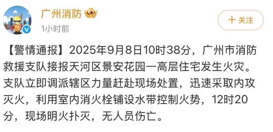 2025年9月8日10时38分,广州市消防救援支队接报天河区景安花园一高层住宅发生火灾。支队立即调派辖区力量赶赴现场处置,迅速采取内攻灭火,利用室内消火栓铺设水带控制火势,12时20分,现场明火扑灭,无人员伤亡。