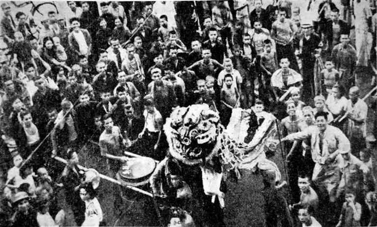 广州民众舞起醒狮,欢庆抗战胜利。