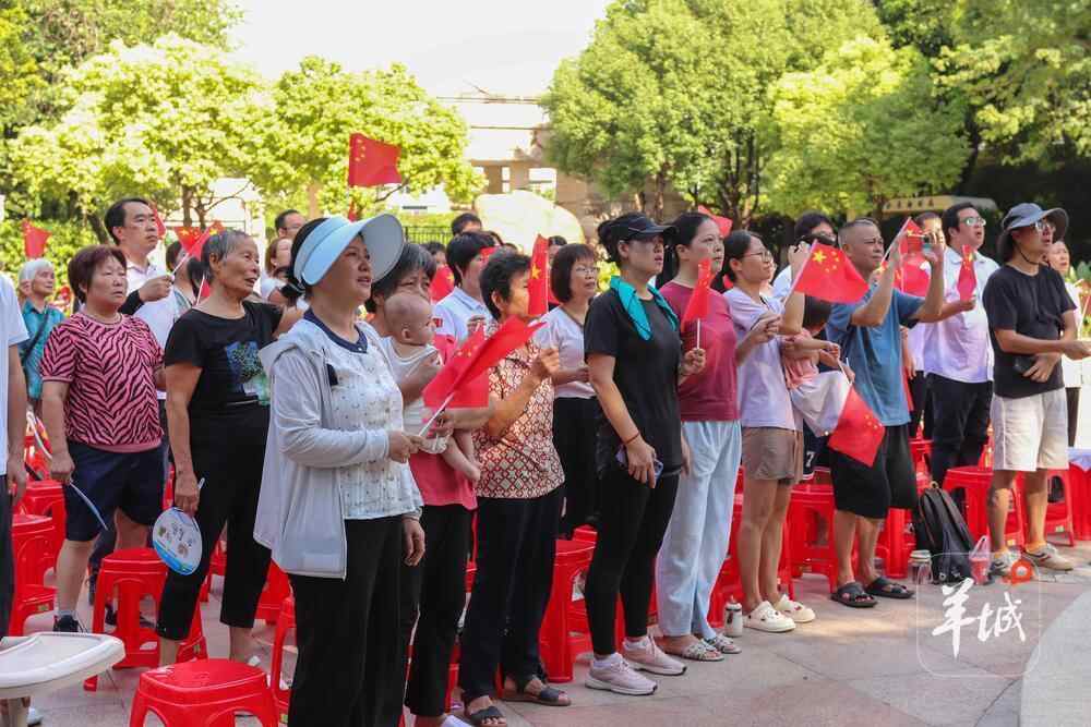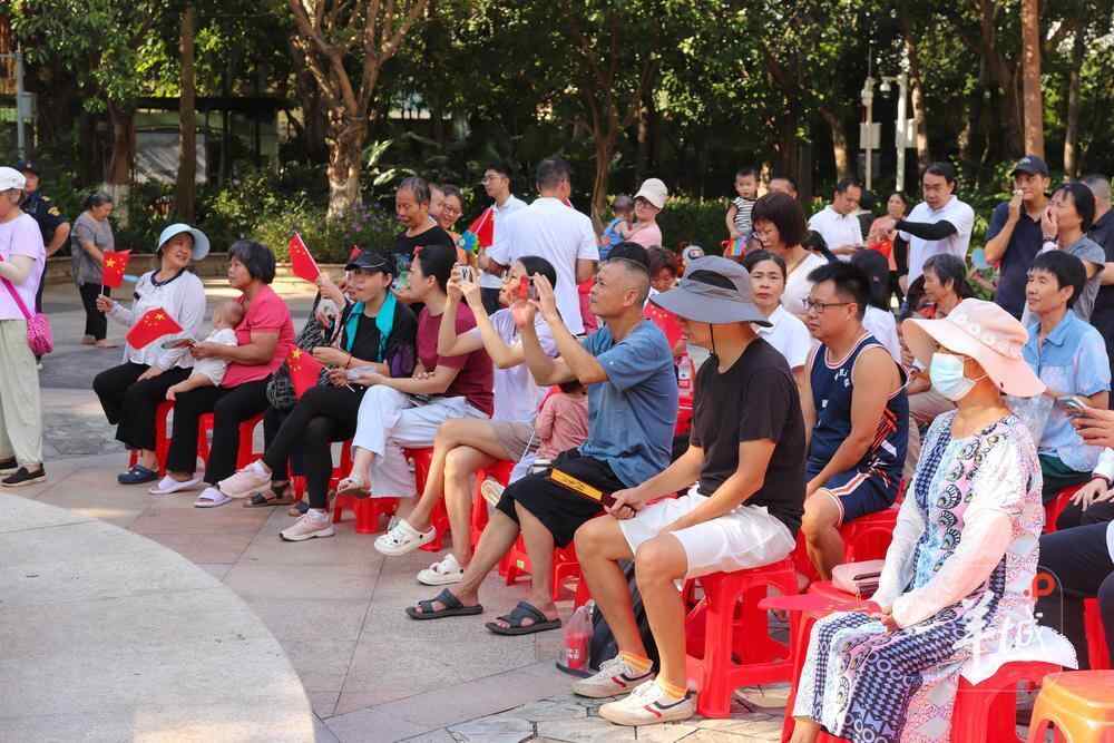 9月3日上午,近100名社区居民、游客和白云区城管部门工作人员一起,齐齐围坐在广州市白云区禁毒主题公园广场大屏前,手持鲜艳的小国旗,凝神观看纪念中国人民抗日战争暨世界反法西斯战争胜利80周年大会直播,共同感受伟大胜利的荣光和喜悦。