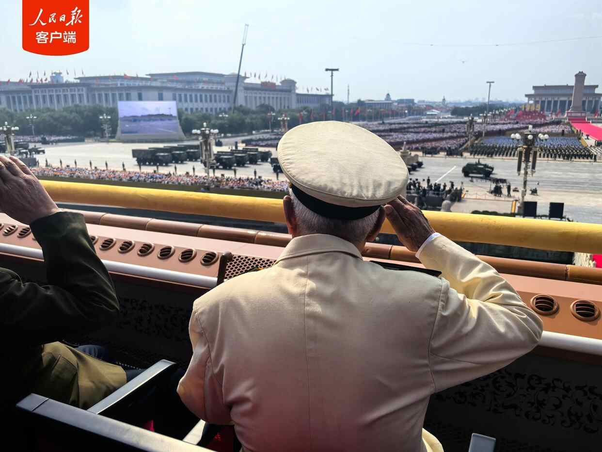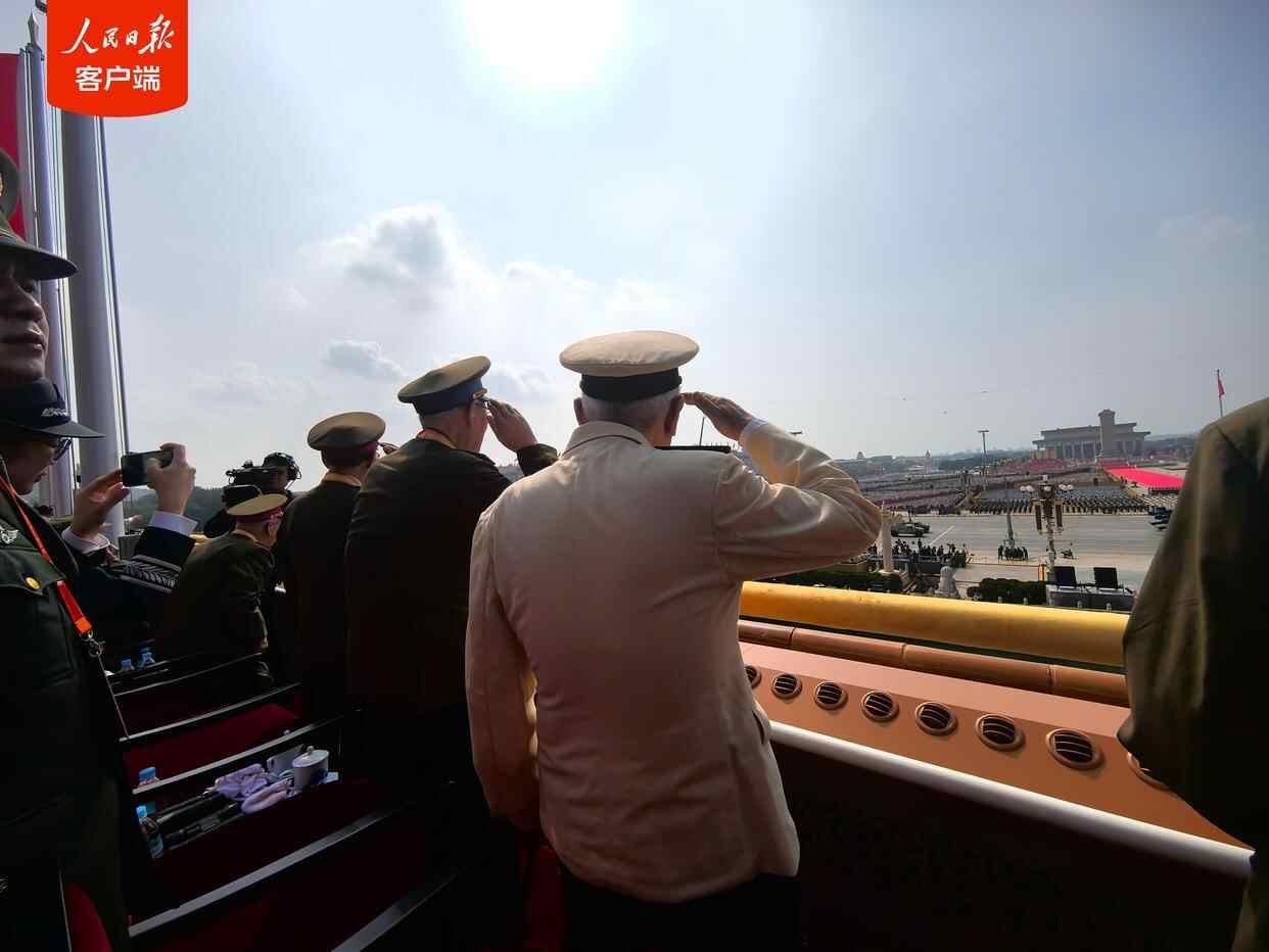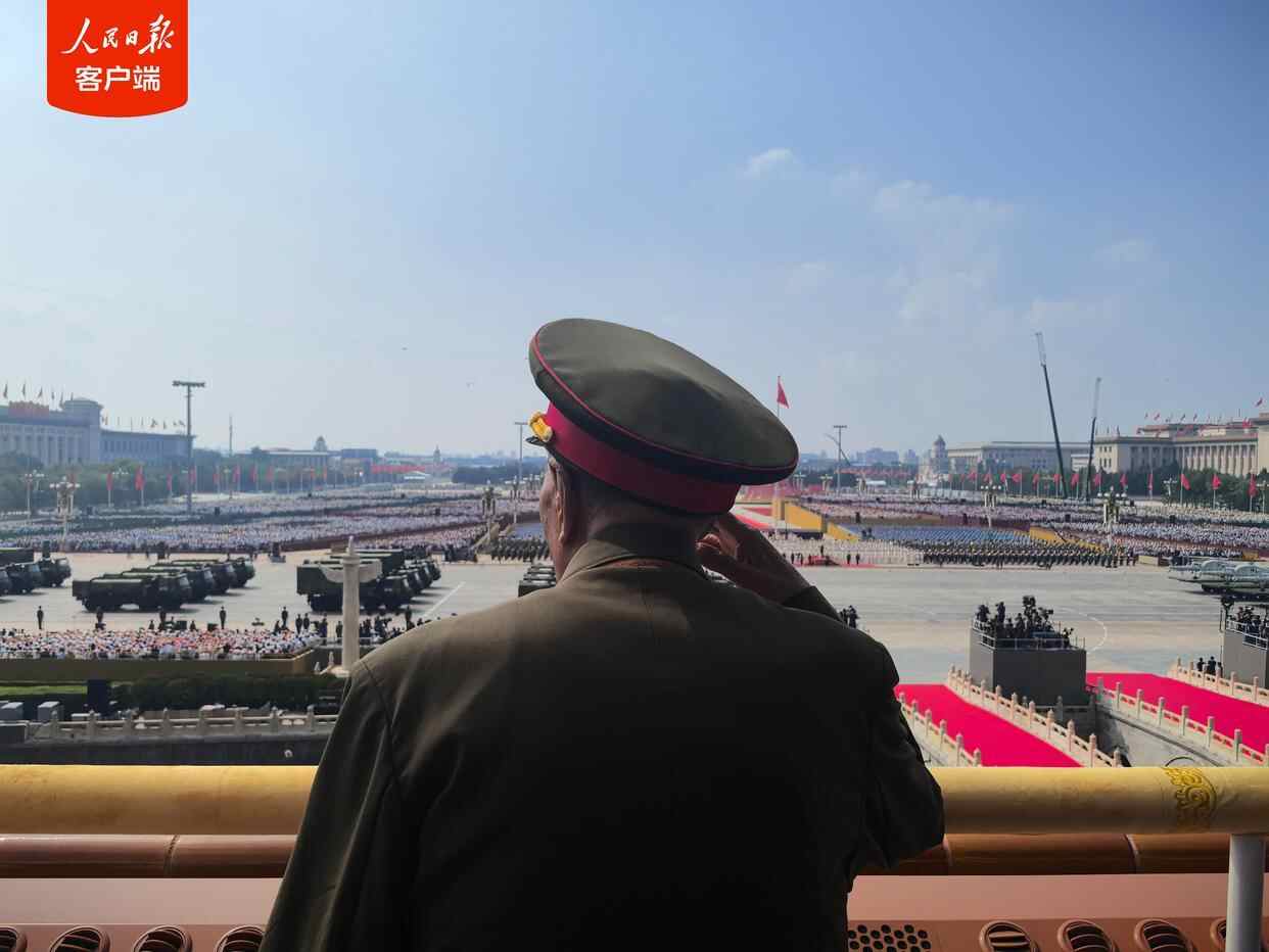 阅兵式期间,天安门城楼上,参加过抗战的老战士老同志,颤颤巍巍地起身敬军礼。这一幕,感动!网友:这是您浴血守卫的山河,致敬!(人民日报记者 杜尚泽)