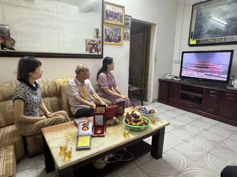 在湛江赤坎,97岁的抗战老战士徐师达与家人一同观看九三阅兵直播。