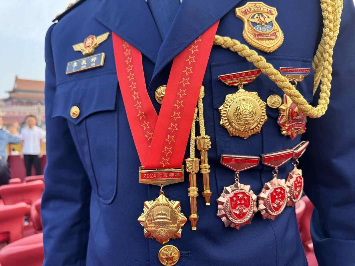 9月3日清晨,在天安门广场的观礼台,一身消防员礼服的李战坤刚一出现,便吸引了大家的目光,他胸前6块闪闪发光的勋章,代表着他在消防救援中屡立战功。