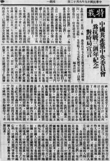 《美洲华侨日报》1940年8月12日特载中国共产党中央委员会关于抗战三周年纪念对时局宣言全文。(中国华侨历史博物馆供图)