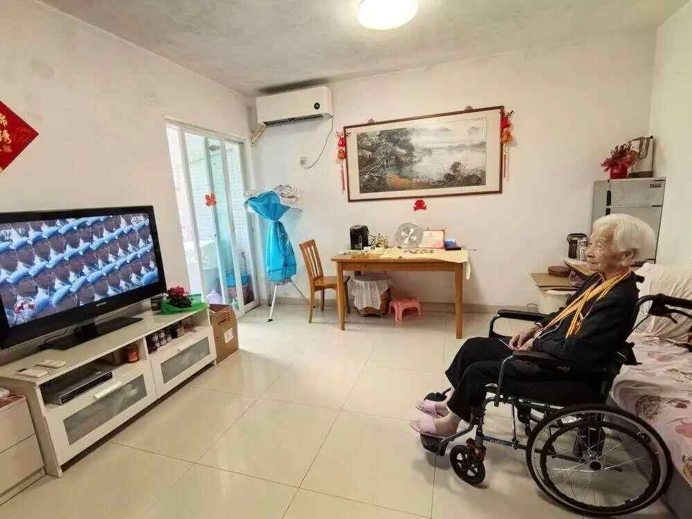 在湛江赤坎,97岁的抗战老战士徐师达与家人一同观看九三阅兵直播。