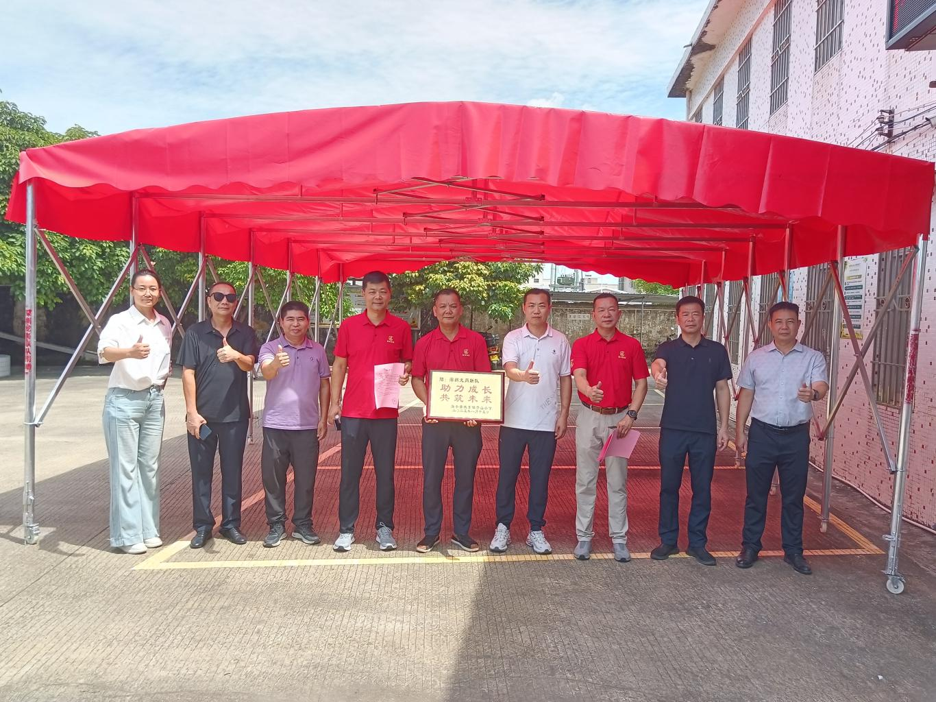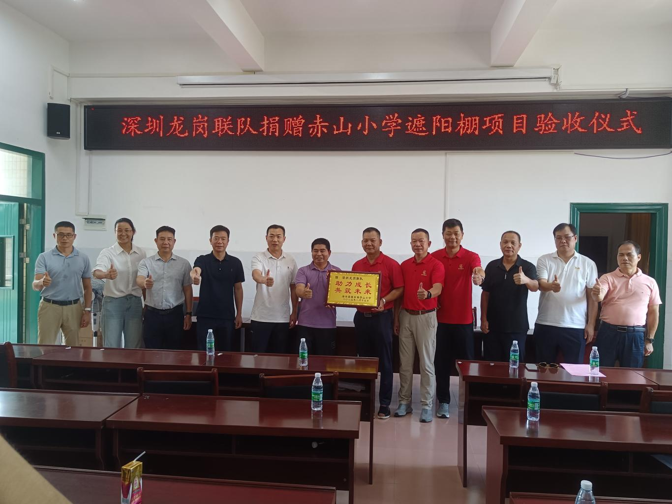 前期,工作队在调研城东镇教育事业发展情况期间,深入了解到赤山小学校门口树木稀少,缺乏可以避雨和遮阳的场所,在高温或狂风骤雨天,等候区的家长、孩子们以及开展交通劝导工作的老师们常常会被淋湿或者暴晒,出现感冒或中暑的情况;同时,了解到学校缺少体育教具。在了解学校的现实需求后,工作队积极行动,迅速链接后方帮扶单位深圳市龙岗区布吉街道。布吉街道充分发挥社会力量作用,加强与深圳龙岗联队沟通交流,积极争取对学校遮雨(阳)棚建设的支持。深圳龙岗联队高度重视,迅速组织人员赴赤山小学调研了解情况,同意捐赠可移动遮雨(阳)棚建设资金3万余元;同时爱心捐赠一张全新的“红双喜”乒乓球台及配套设施,总价值3000余元。