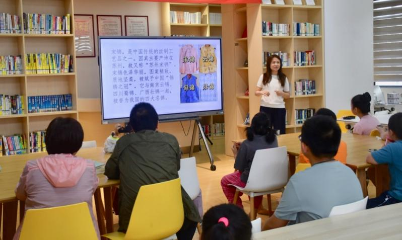 在非遗宋锦体验活动中,老师向家长和孩子们介绍了宋锦的价值及渊源。从宋代宫廷织造工艺的起源,到72道工序的复杂制作流程,再到纹样中蕴含的“福寿安康”等吉祥寓意,大家听得津津有味,深刻感受非遗宋锦“华而不炫,贵而不显”的独特魅力。