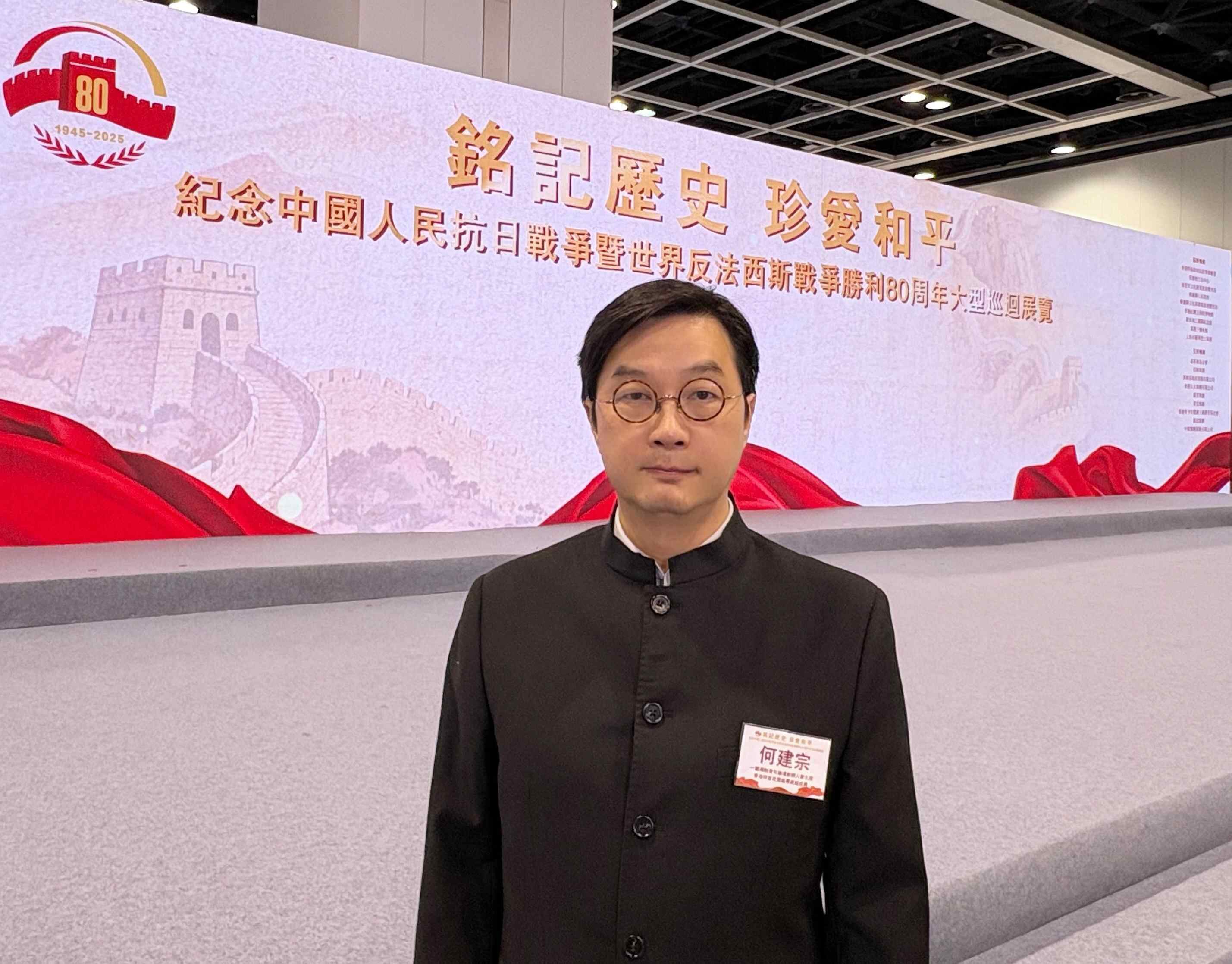 香港特首政策组专家组成员何建宗博士穿上传统的中山装观礼,向抗战先烈、中国人民解放军致敬。何建宗多年从事政策研究和青年工作,他表示将继续通过所创的智库力量为国家、为香港特区政府出谋献策,培养爱国爱港的青年人才,说好香港故事。