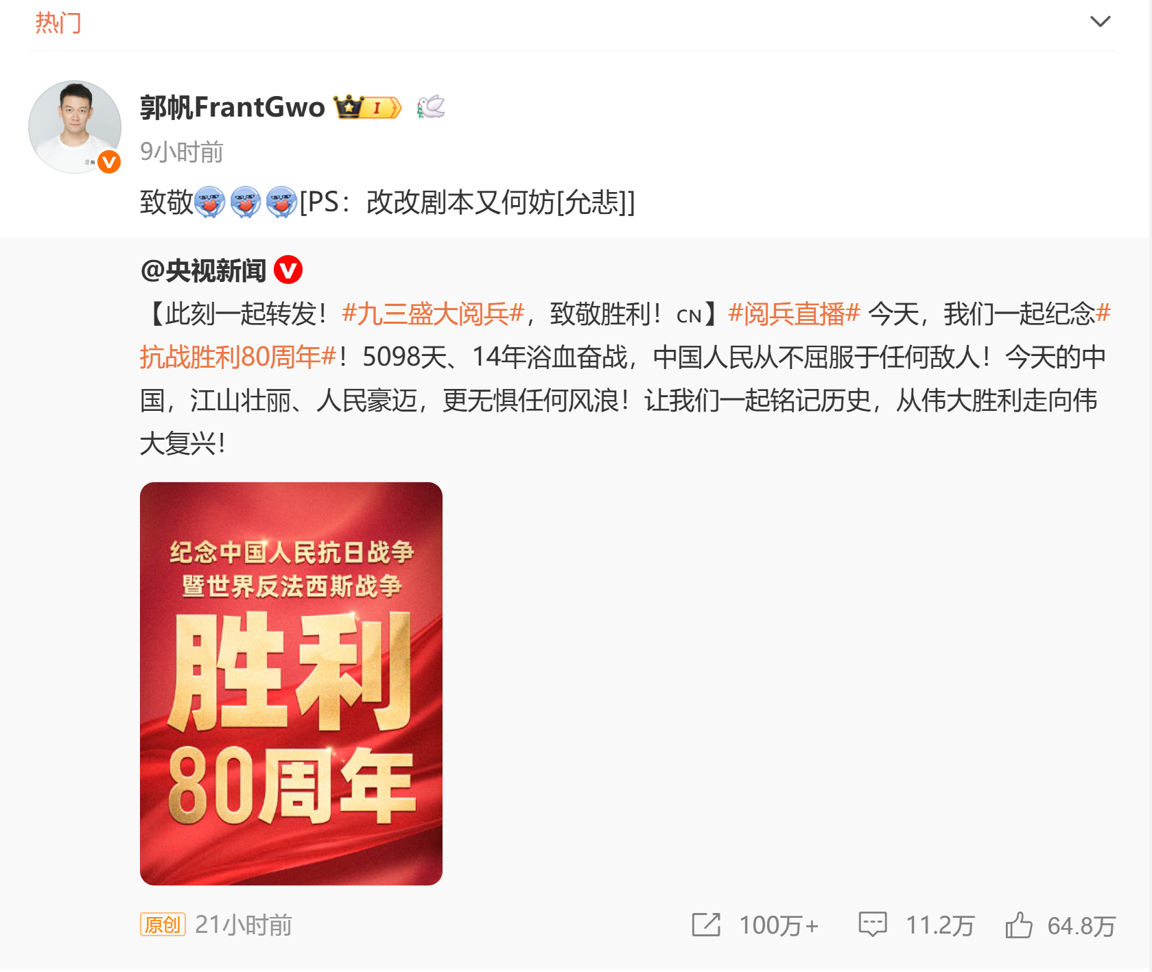 “球3再不上映就要成纪录片啦!”盛大的九三阅兵刚结束,《流浪地球》系列电影的导演郭帆就被热血沸腾的网友们“cue”上了热搜。对此,郭帆转发央视新闻表示致敬,并称“改改剧本又何妨”,相关话题迅速登上热搜。
