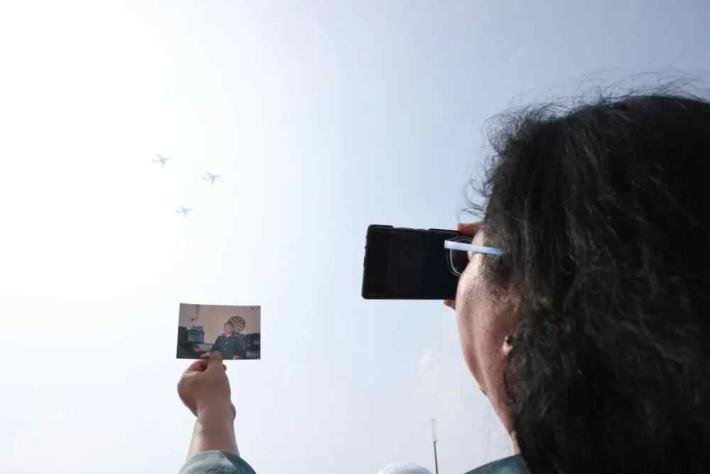 当空中梯队飞过天安门广场时,“海空卫士”王伟的妻子阮国琴在观礼台上把王伟的照片举向蓝天,她大声说:“王伟,你和战友们又见面了!”