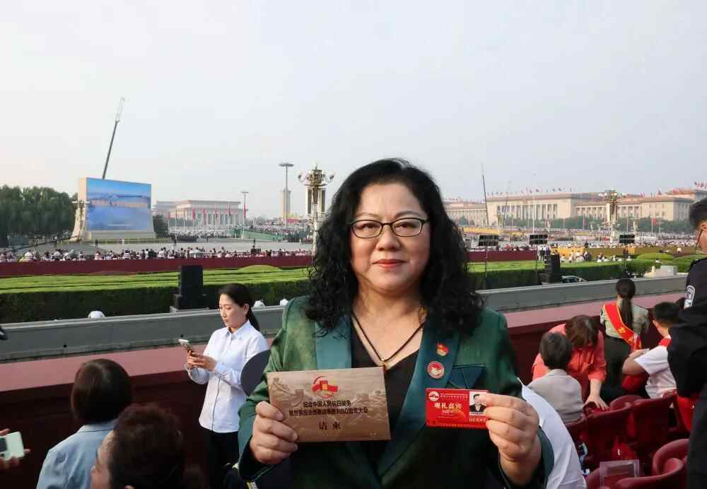 9月3日上午,“海空卫士”王伟遗孀阮国琴带着王伟照片,在北京天安门广场观看阅兵。