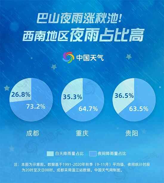 1100多年前的一个秋雨夜,客居异乡的诗人李商隐写下“巴山夜雨涨秋池”,说的就是华西地区多夜雨的特点。气象大数据也证实了四川、重庆一带的夜雨概率确实很高,多地六成以上降雨量出现在夜间。