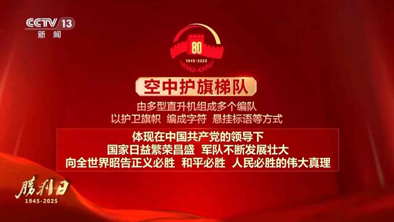 这次阅兵,编设45个方(梯)队。其中,空中护旗梯队,由多型直升机组成多个编队,以护卫旗帜、编成字符、悬挂标语等方式,体现在中国共产党的领导下,国家日益繁荣昌盛、军队不断发展壮大,向全世界昭告正义必胜、和平必胜、人民必胜的伟大真理。