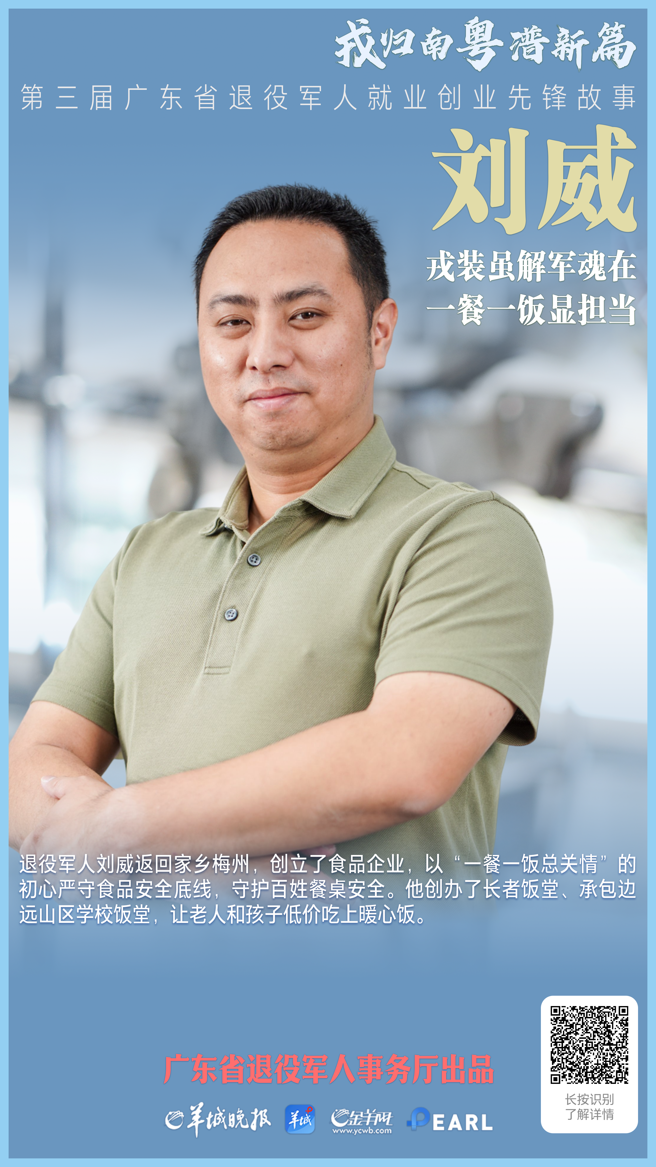 从一名优秀士兵到千万身家“猪肉佬”,“90后”小伙、梅州市蕉岭县太乙崇光农业科技有限公司总经理刘威退役不褪色,在创业赛场续写荣光:成功不忘回报社会,他先后创办9家长者饭堂、承包8间边远山区学校饭堂,让老人和孩子低价吃上暖心饭,即便亏损,也从不涨价;新冠疫情、梅州暴雨灾害,他总是冲锋在前,保障物资供应安全……