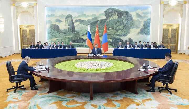 习近平指出,近年来,中俄蒙三方合作稳步发展,取得实实在在的成果。三方合作中期路线图顺利实施,三国贸易额节节攀升,经贸、科技、生态保护、人文合作不断深化。作为山水相连、休戚与共的友好邻邦,中方愿同俄方、蒙方一道,坚守合作初心,排除外部干扰,携手推动三方合作高质量发展。