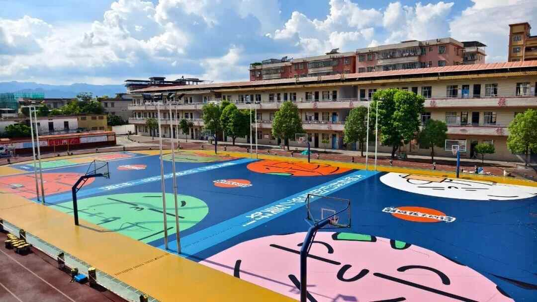 程升:非常满意。一方面是篮球场、班牌等空间、物料的颜色都还原得很好,比昨天在手机上看照片更有冲击力,一进门还是被惊艳到了。另一方面是学生们看到这些可爱明亮的图案,都忍不住在上面奔跑,大人们忍不住拿起手机拍照。我想,这就是我们想要的效果。