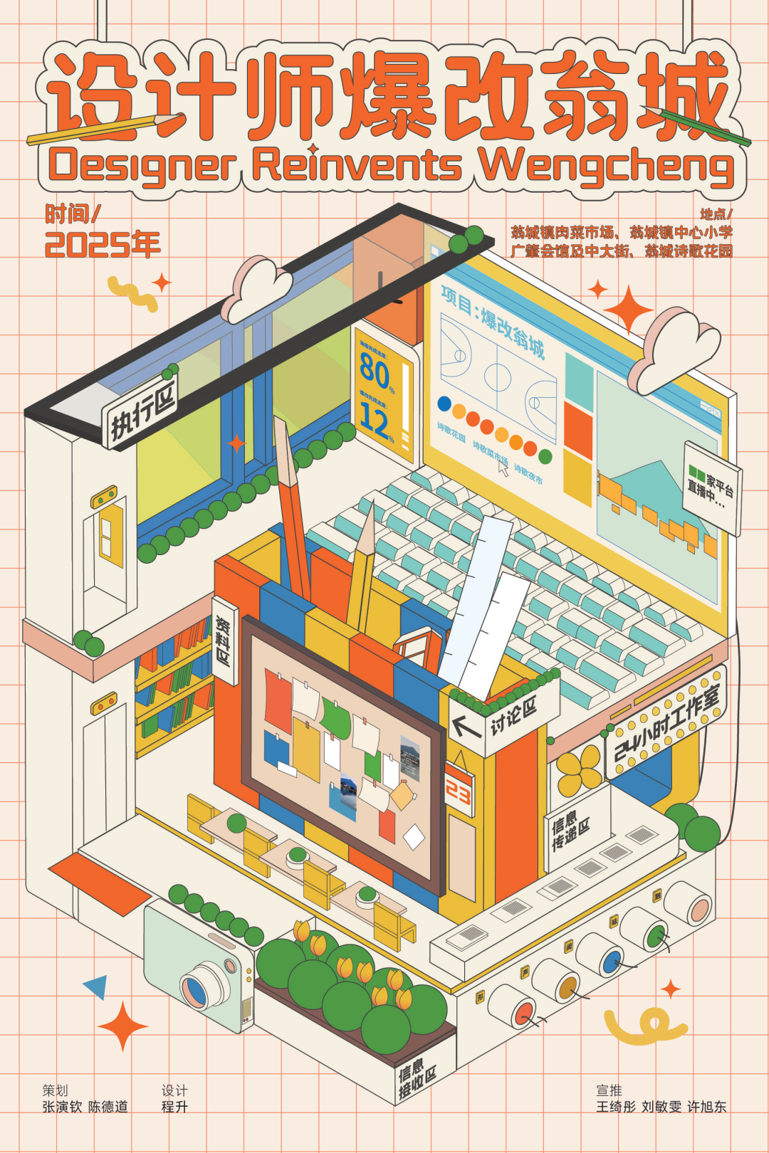 程升:因为诗歌宝宝是最恰当的图案。一开始,我有想过只是放文字,或者是比较扁平的图形组成与体育、学校相关的元素,但是出来的效果总是感觉缺少了一些趣味,也提炼不出翁城的特点。于是我们提出还是加入诗歌宝宝的元素,把诗歌宝宝和操场的框架结合,加上主题的色彩,既有翁城的独特元素,又有诗歌的象征,小朋友也喜欢,所以有了现在的画面。