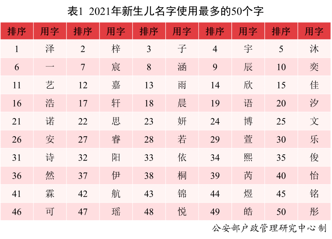 2021年出生并已经进行户籍登记的新生儿名字中,使用最多的50个字如下图。