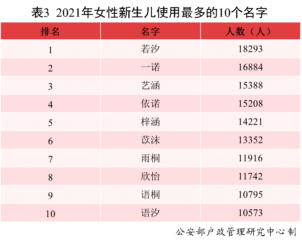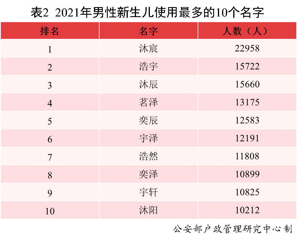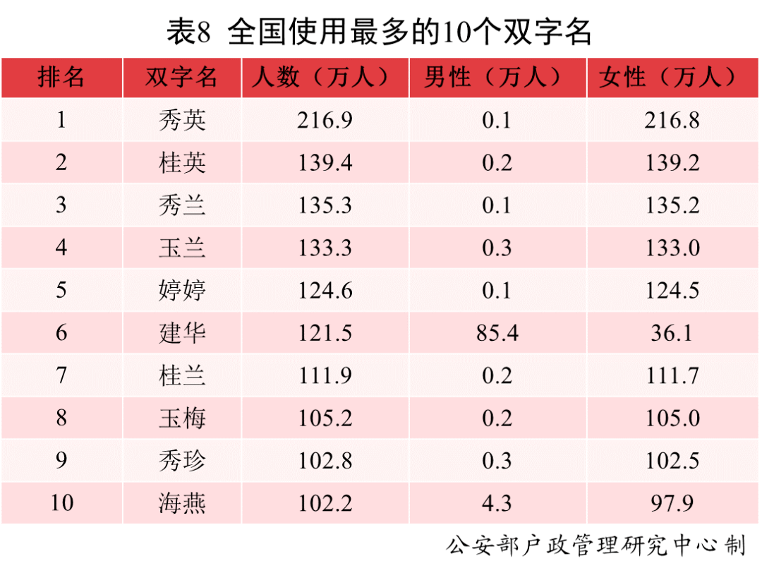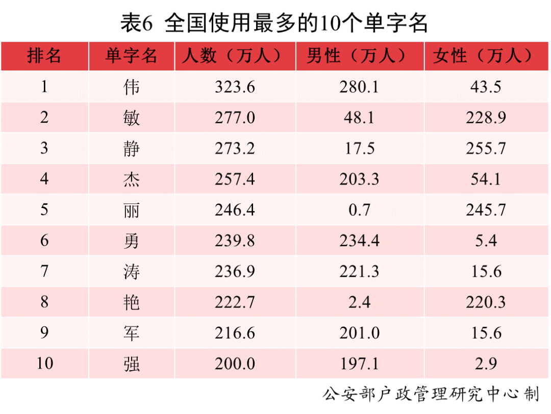 公安部曾发布《二〇二一年全国姓名报告》。全国户籍人口中使用频率最高的10个单字名和10个双字名如下。