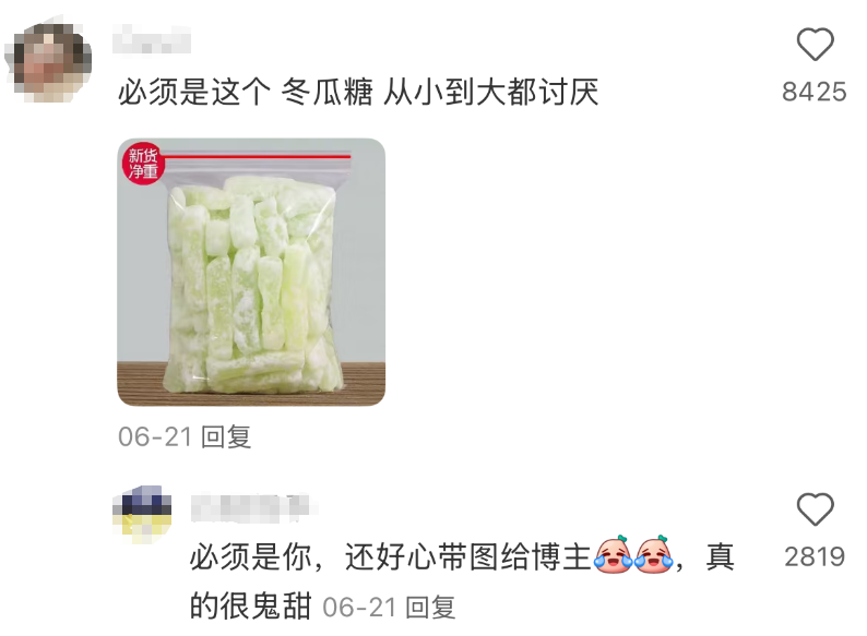 糖冬瓜甜到锁喉,每一根都像裹满糖霜的肥肉,猪油糖油腻齁人,像在嚼甜肥肉、腻到打颤,每一口都是对现代味蕾的暴击,强烈推荐给同事,共同体验什么叫“甜到灵魂出窍,吃一口再没有第二口。”