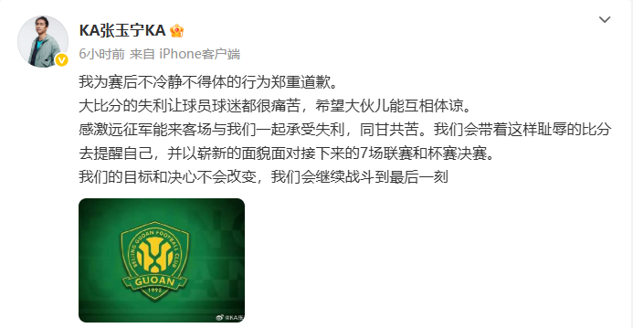 我为赛后不冷静不得体的行为郑重道歉。大比分的失利让球员球迷都很痛苦,希望大伙儿能互相体谅。感激远征军能来客场与我们一起承受失利,同甘共苦。我们会带着这样耻辱的比分去提醒自己,并以崭新的面貌面对接下来的7场联赛和杯赛决赛。我们的目标和决心不会改变,我们会继续战斗到最后一刻。