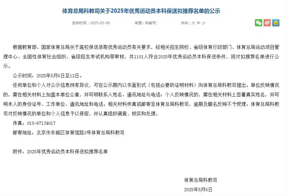 5月6日,体育总局科教司发布2025年优秀运动员本科保送拟推荐名单,全红婵的保送资格进一步公示确认。