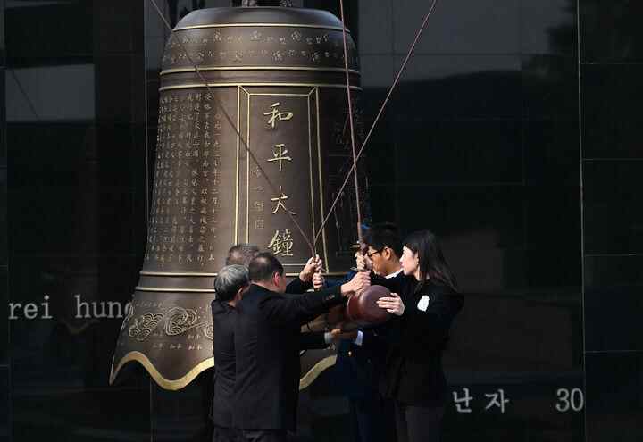 社会各界代表在侵华日军南京大屠杀遇难同胞纪念馆撞响和平大钟(2024年12月13日摄)。新华社记者 季春鹏 摄