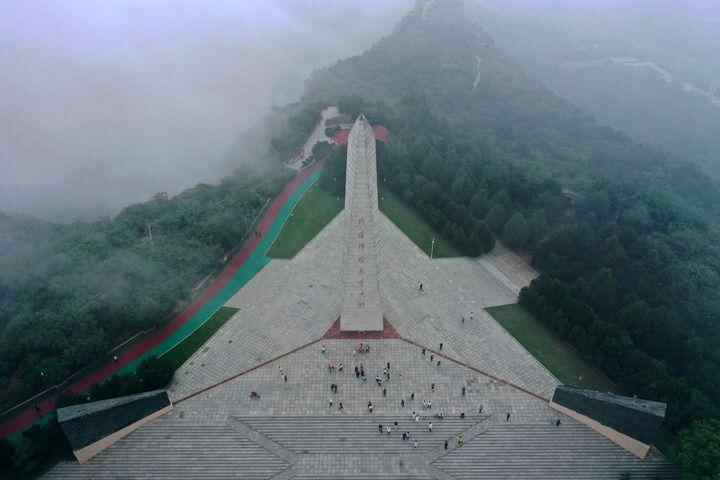 游客在山西省阳泉市百团大战纪念碑参观(2025年7月8日摄,无人机照片)。新华社记者 詹彦 摄