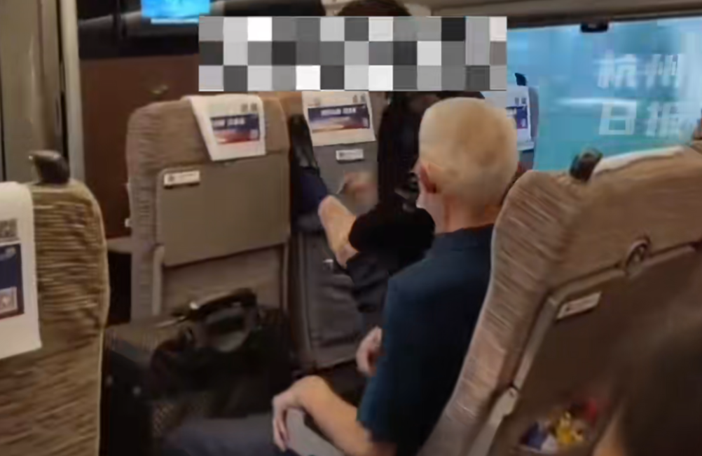 2023年6月,河南某高铁上,大爷不满前排旅客调节座椅靠背,疯狂踢踹前排座椅。