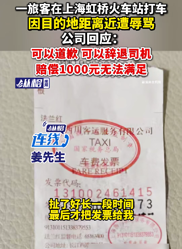涉事出租车所属的上海西川客运服务有限公司工作人员告诉记者,其接到投诉电话后已与当事人沟通,可以满足对方提出的辞退司机、公司领导与司机登门道歉这两个诉求,但暂时无法满足1000元经济赔偿的要求,“我还需要向领导汇报。”