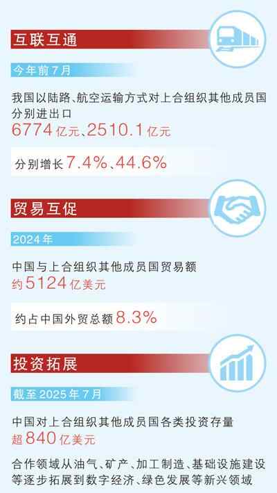 互联互通不断加强,助力上合组织经贸合作迈上新台阶。今年前7个月,中国对上合组织其他成员国进出口2.11万亿元,同比增长3%,规模创历史同期新高。贸易数据持续上升,印证“上合组织大家庭”合作共赢的活力与韧性。
