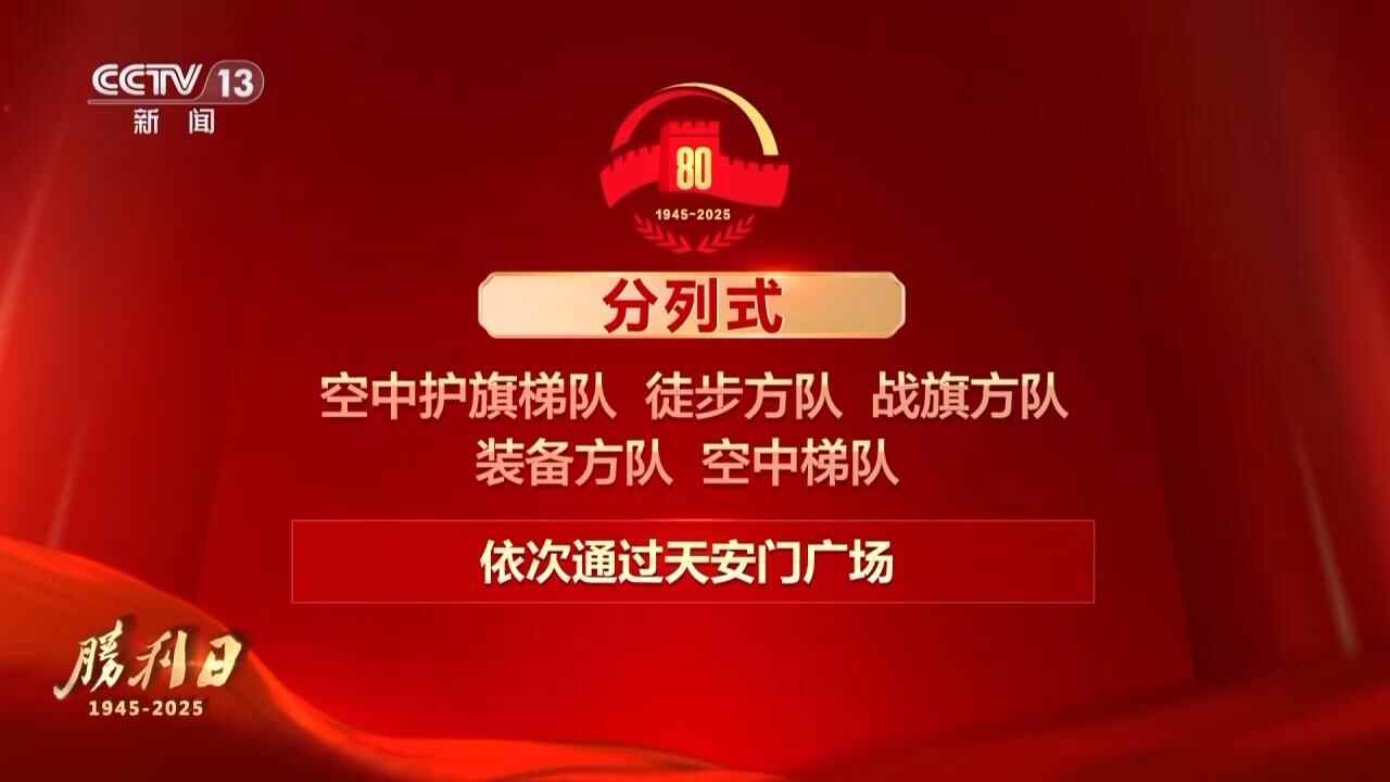 本次阅兵分列式中,将按照空中护旗梯队、徒步方队、战旗方队、装备方队、空中梯队的顺序,依次通过天安门广场。