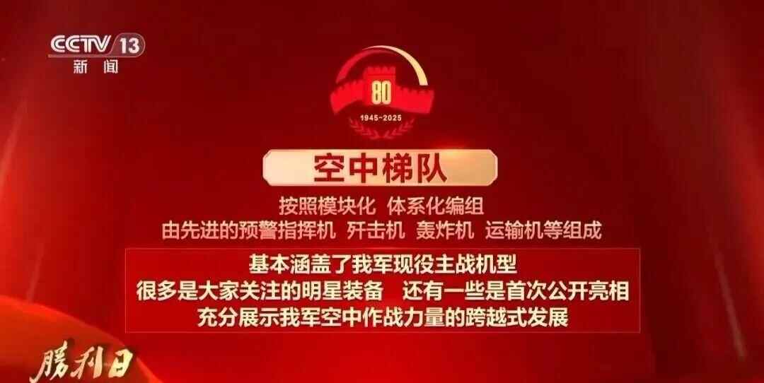 空中梯队,按照模块化、体系化编组,由先进的预警指挥机、歼击机、轰炸机、运输机等组成,基本涵盖了我军现役主战机型,很多是大家关注的明星装备,还有一些是首次公开亮相,充分展示我军空中作战力量的跨越式发展。